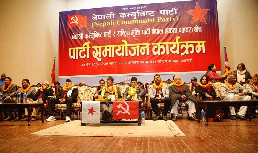 काठमाडौंको राष्ट्रियसभागृहमा आयोजित समारोहमा नेकपाका संयोजक पुष्पकमल दाहाल प्रचण्ड, सहसंयोजक माधवकुमार नेपाल, नेताहरु झलनाथ खनाल, वामदेव गौतम लगायतका नेताहरु सहभागी भएका छन् ।