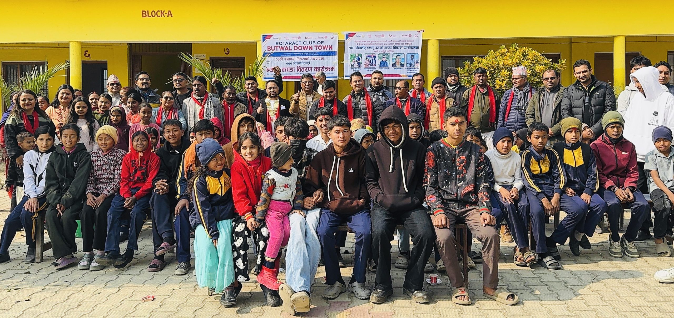कपिलवस्तु । रोट्रयाक्ट क्लब अफ बुटवल डाउन टाउनले आफ्नो २४ औँ स्थापना दिवसको अवसरमा कपिलवस्तुको बाणगंगा नगरपालिका-११ स्थित श्री हेमराज माध्यमिक विद्यालयमा अध्ययनरत १०१ जना विद्यार्थीलाई न्यानो कपडा वितरण गरेको छ ।