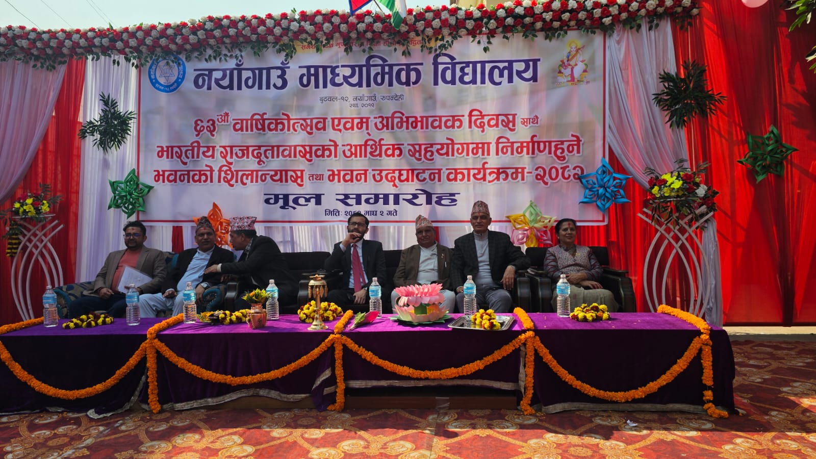 बुटवल । बुटवल उपमहानगरपालिका-१२ नयाँगाउमा रहेको नयाँगाउँ माध्यमिक विद्यालयले ६३ औँ वार्षिकोत्सव तथा अभिभावक दिवस विविध कार्यक्रमका साथ मनाएको छ । वार्षिकोत्सवको अवसरमा भारतीय राजदूतावासको आर्थिक सहयोगमा निर्माण हुन लागेको १२ कोठे भवनको शिलान्यास तथा बुटवल उपमहानगरपालिकाको सहयोगमा निर्माण गरिएको सभाहल र दुई कक्षाकोठासहितको भवन उद्घाटन गरिएको हो ।