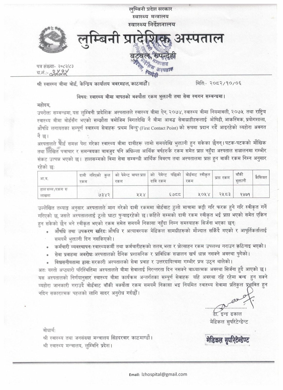 अस्पतालले स्वास्थ्य बीमा बोर्ड बबरमहल काठमाडौँलाई पत्राचार गर्दै बीमा कार्यक्रम बन्द गर्नुपर्ने अवस्थामा पुगेको जानकारी गराएको छ । अस्प्तालका मेडिकल सुपेरिटेन्डेन डा. इन्द्र ढकालका अनुसार अस्पतालबाट दाबी रकम मध्ये बीमा बोर्डबाट स्वीकृत भएको रकम २४ करोड ७१ लाख रुपैयाँ प्राप्त हुन नसक्दा औषधी तथा उपकरण खरिदमा समस्या सिर्जना हुनुका साथै कर्मचारीहरुलाई सेवा सुविधा समेत उपलब्ध गराउन नसकिने अवस्थामा सिर्जना भएको छ । दैनिक करिब एक हजार पाँच सय सेवाग्राहीले स्वास्थ्य बीमा कार्यक्रम अन्तरगत सेवा लिने यस अस्पतालमा दाबी रकम भुक्तानी नहुँदा आर्थिक संकट पर्दै गएपछि बीमा कार्यक्रमनै स्थगित गर्नुपर्ने बाध्यात्मक अवस्थामा पुगिको मेसु डा. ढकालले गुनासो गरे ।