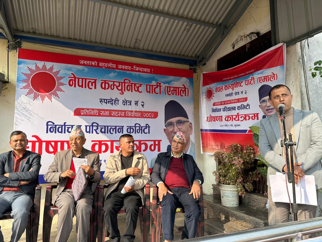 निर्वाचन परिचालन समितिका संयोजक भोजप्रसाद श्रेष्ठले रुपन्देहीको सुकुम्बासी समस्या समाधान गर्न एमाले सधैं प्रतिबद्ध भएर लागेको स्मरण गराए । उनले जनताको सुख-दुःखमा एमाले सधैं साथमा रहेको भन्दै यस पटक पनि एमालेको पक्षमा मत दिन आग्रह गरे ।