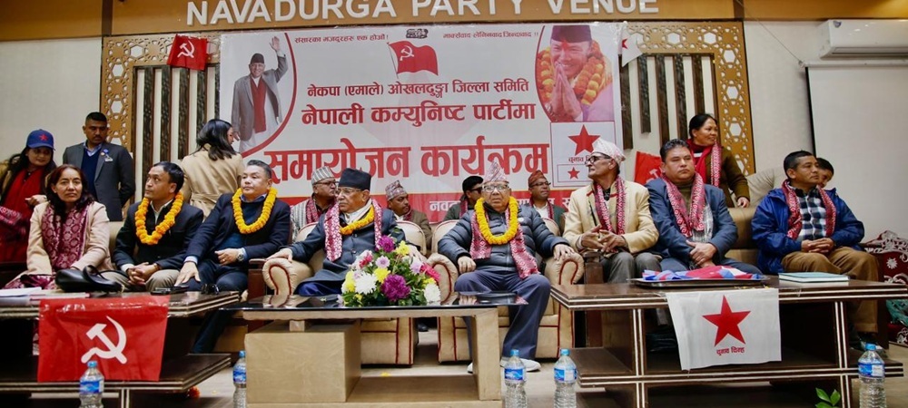 नेपाल कम्युनिष्ट पार्टी (एमाले)को ओखलढुङ्गा जिल्ला कमिटी सामूहिक रूपमा नेपाली कम्युनिष्ट पार्टी (नेकपा)मा समाहित भएको हो । आज आयोजित कार्यक्रममा एमाले ओखलढुङ्गा जिल्ला अध्यक्ष ज्ञानबहादुर खड्का, उपाध्यक्ष कमलप्रसाद न्यौपाने, सचिव अशोक थापा, उपसचिव राजीव कटुवाललगायतका पदाधिकारी तथा नेता कार्यकर्तासहित ३८ जना नेपाली कम्युनिष्ट पार्टीमा समाहित भएको हो ।
