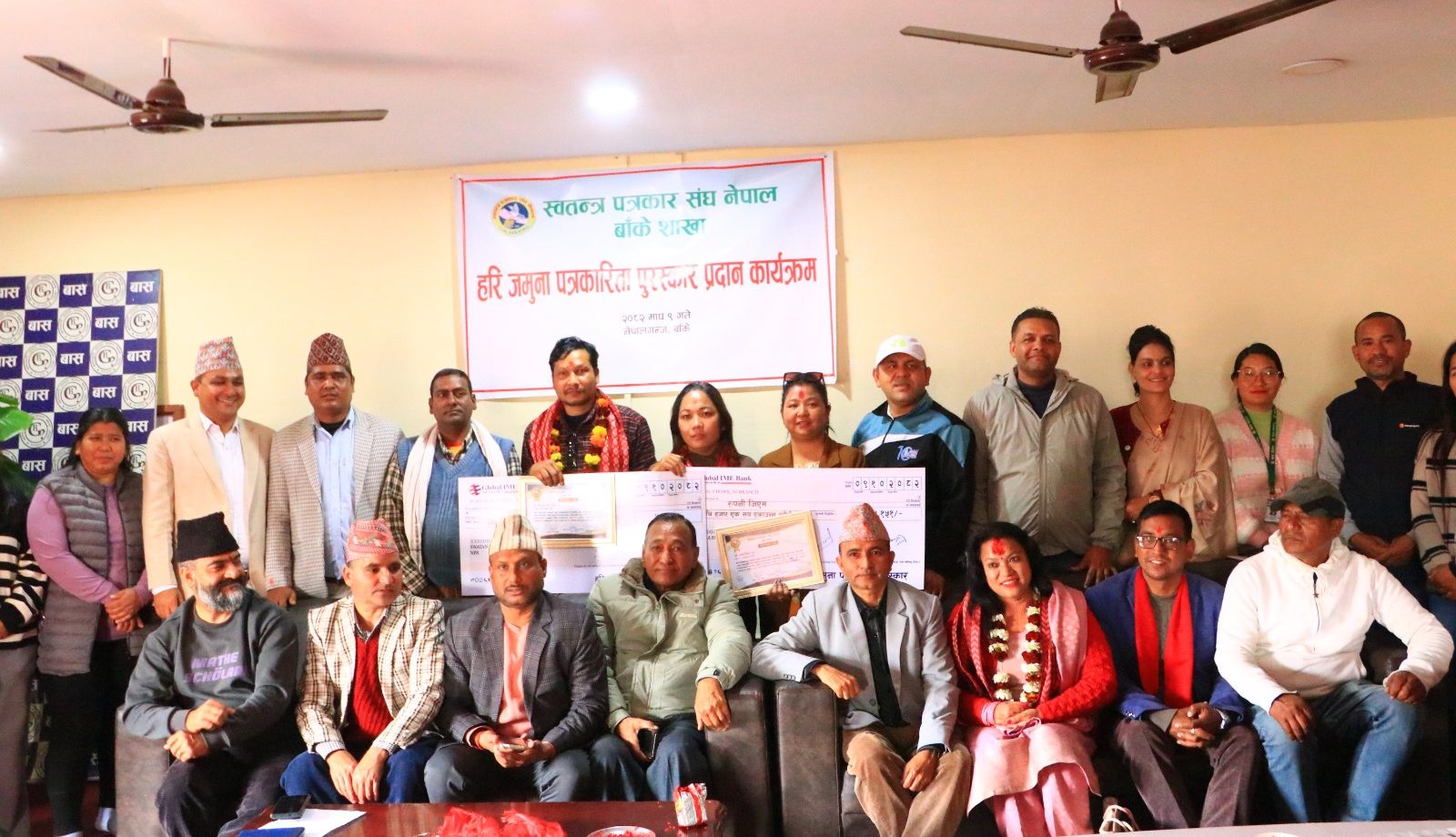स्वतन्त्र पत्रकार संघ नेपाल बाँके शाखाले प्रदान गर्ने गरिएको यस वर्षको हरि जमुना पत्रकारीता पुरस्कार पत्रकार भगत राम थारु र पत्रकार रुपनी जिएमलाइ प्रदान गरिएको छ । शिक्षक तथा समाजसेवी माधबी शाहले स्वतन्त्र पत्रकार संघ नेपाल बाँके शाखा मार्फत आफ्नो स्वर्गीय माता पिताको नामबाट स्थापना गरेको हरी जमुना स्मृती अक्षय कोष मार्फत उक्त पुरस्कार प्रदान गरिएको हो ।