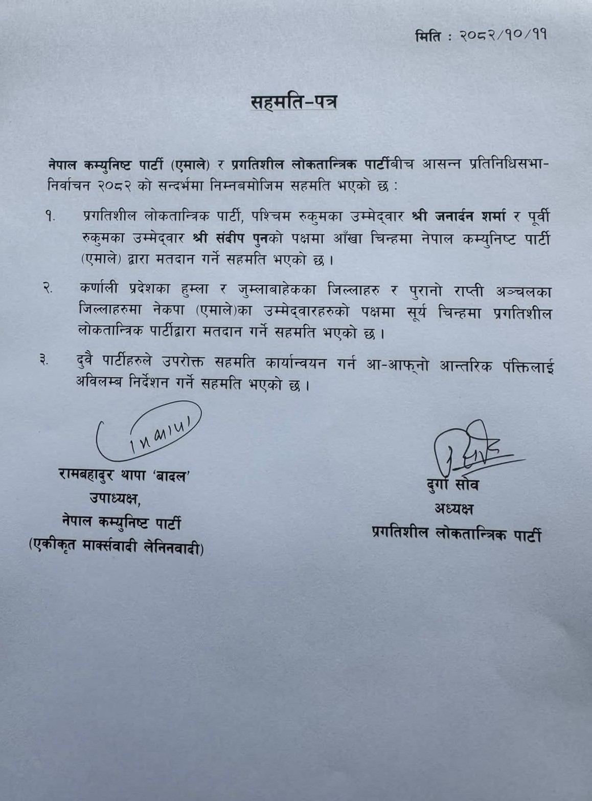 एमाले र प्रगतिशील लोकतान्त्रिक पार्टी (प्रलोपा) बीच रुकुम पश्चिम, रुकुम पूर्वसहित साविक राप्ती अञ्चल र डोल्पा जुम्ला छोडेर कर्णाली अञ्चलका जिल्लामा चुनावी तालमेल गर्ने सहमति भएको हो ।