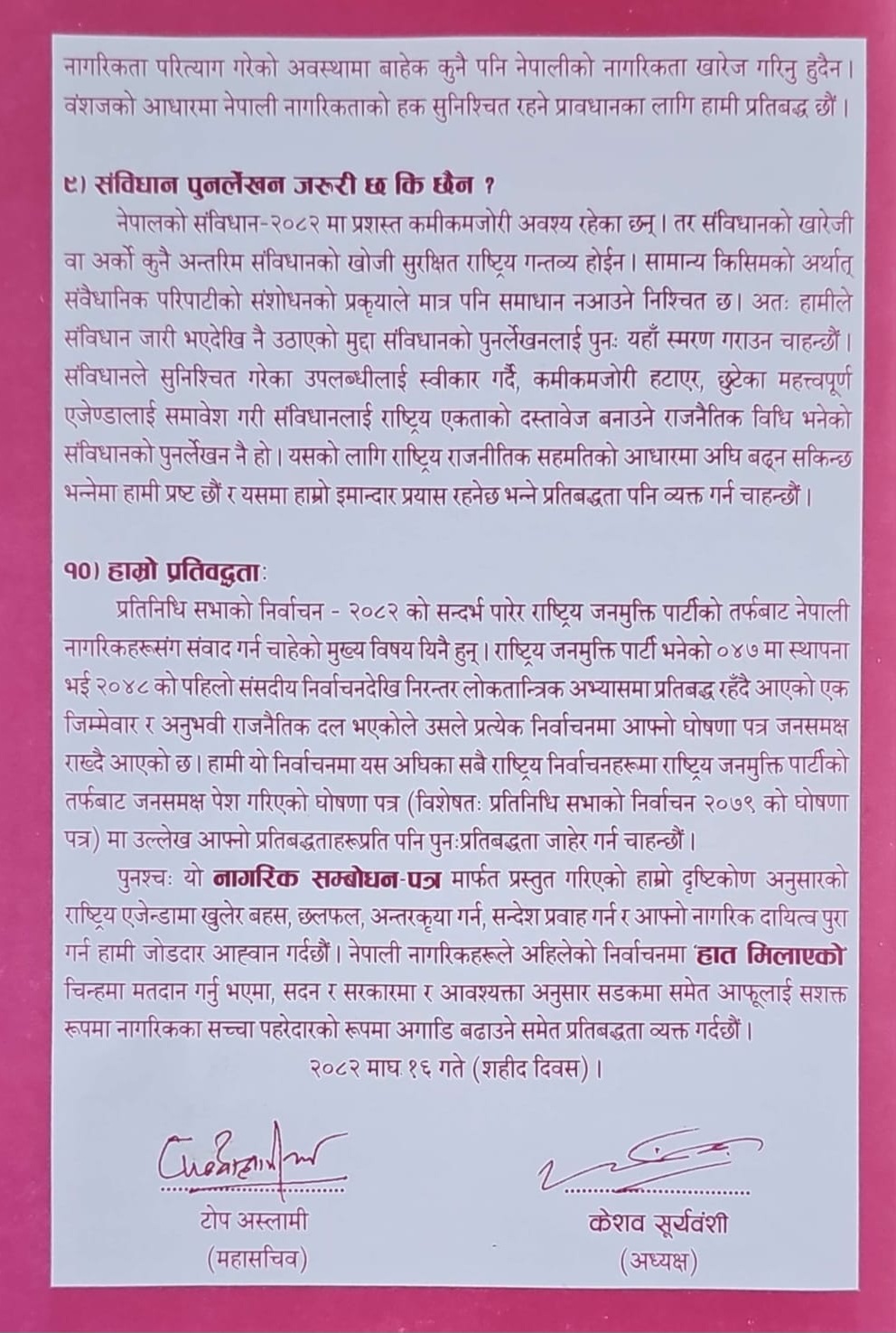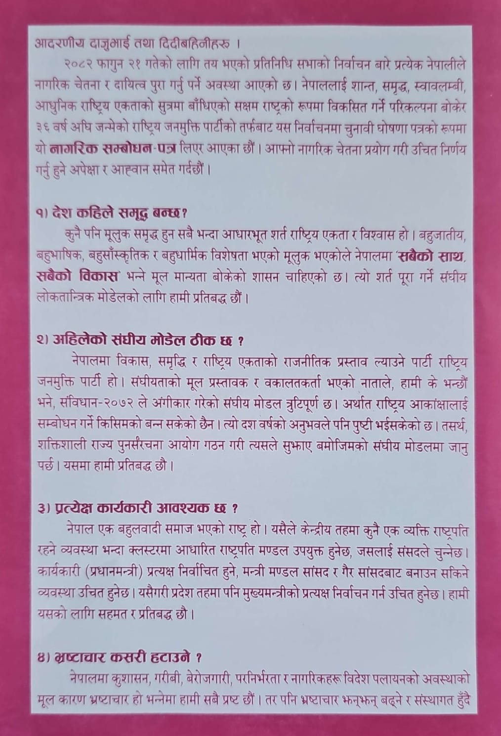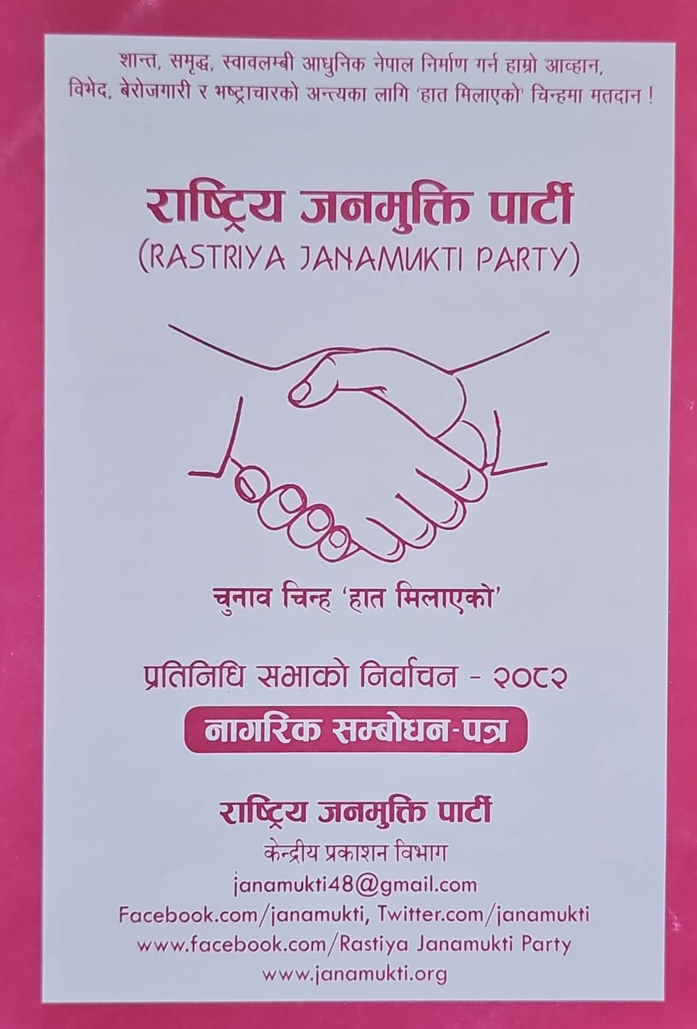 राष्ट्रिय जनमुक्ति पार्टीद्वारा प्रतिनिधिसभा निर्वाचनका लागि १० बुँदे चुनावी घोषणापत्र सार्वजनिक