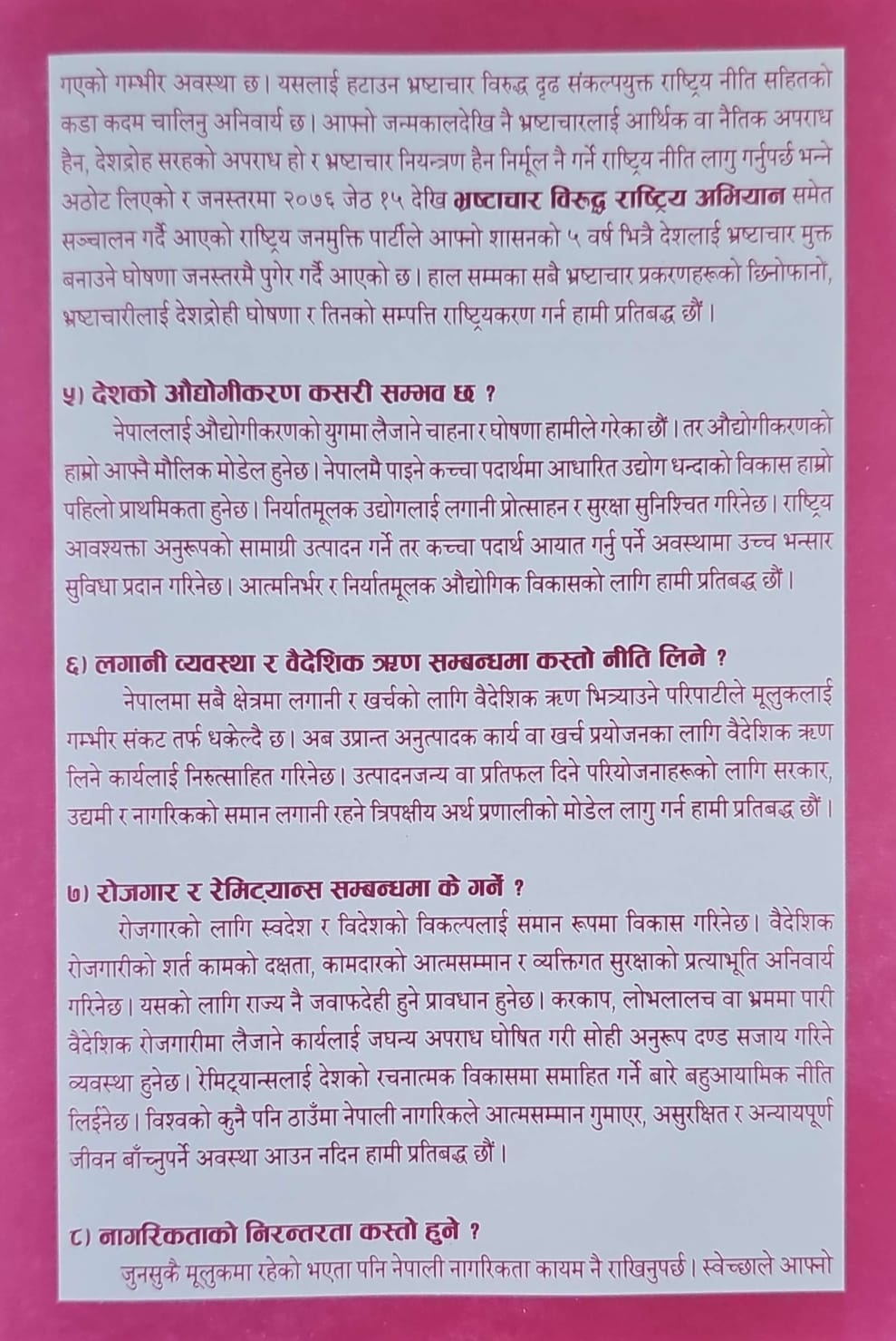 पार्टी नेतृत्वका अनुसार घोषणापत्र नागरिकको अधिकार, समावेशिता र सुशासनलाई केन्द्रमा राखेर तयार गरिएको हो ।