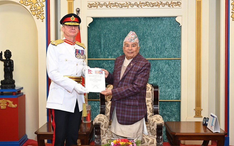 काठमाडौं । राष्ट्रपति रामचन्द्र पौडेलसमक्ष संयुक्त अधिराज्य बेलायती सेनाका मेजर जेनरल जेरल्ड एम स्ट्रिकलेण्डसहितको टोलीले गोर्खा विग्रेडको वार्षिक प्रतिवेदन प्रस्तुत गरेको छ ।