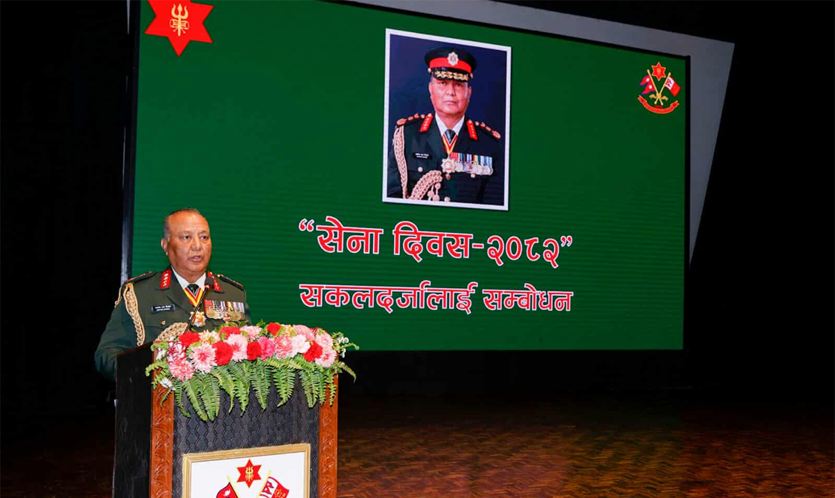 महाशिवरात्रि तथा २६२औँ सेना दिवसका अवसरमा आज सैनिक मुख्यालयमा आयोजित विशेष कार्यक्रममा नेपाली सेनाका सकल दर्तालाई शुभकामनासहित सम्बोधन गर्दै उनले नेपाली सेनाले विभिन्न क्षेत्रहरुमा निर्वाह गर्दै आइरहेको जिम्मेवारीलाई उत्कृष्ट ढंगले पूरा गर्ने क्रममा निर्वाचनलाई शान्तिपूर्ण रुपमा सम्पन्न गराउन समेत विशेष निर्देशन दिए ।