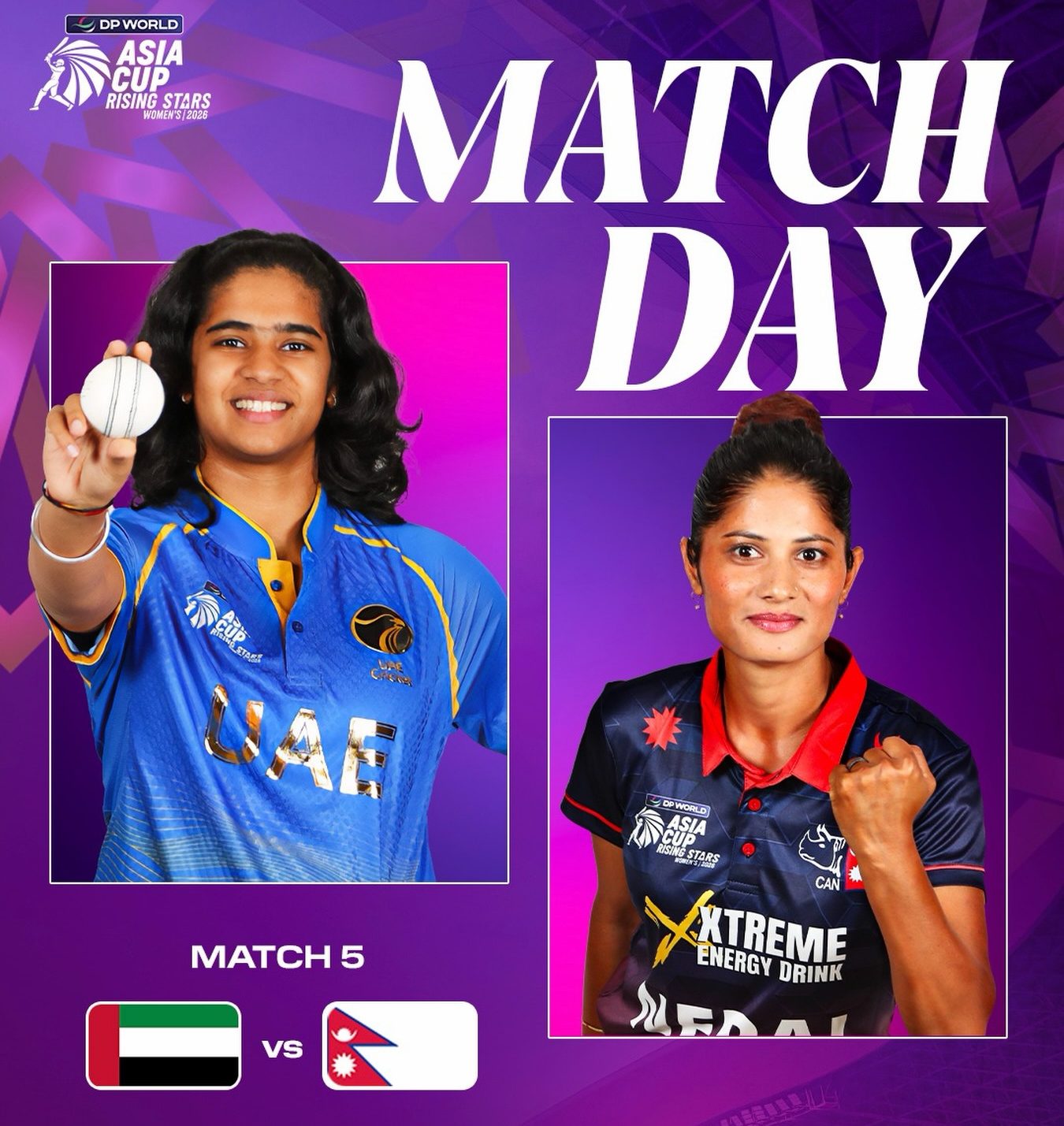 काठमाडौं । महिला एशिया कप राइजिंग स्टार्स क्रिकेट प्रतियोगिताअन्तर्गत नेपालले आज युएईसँग प्रतिस्पर्धा गर्दैछ । थाइल्याण्डमा जारी प्रतियोगितामा नेपाल र युएईबीचको खेल नेपाली समयअनुसार बिहान ८ः१५ बजे सुरु हुनेछ ।