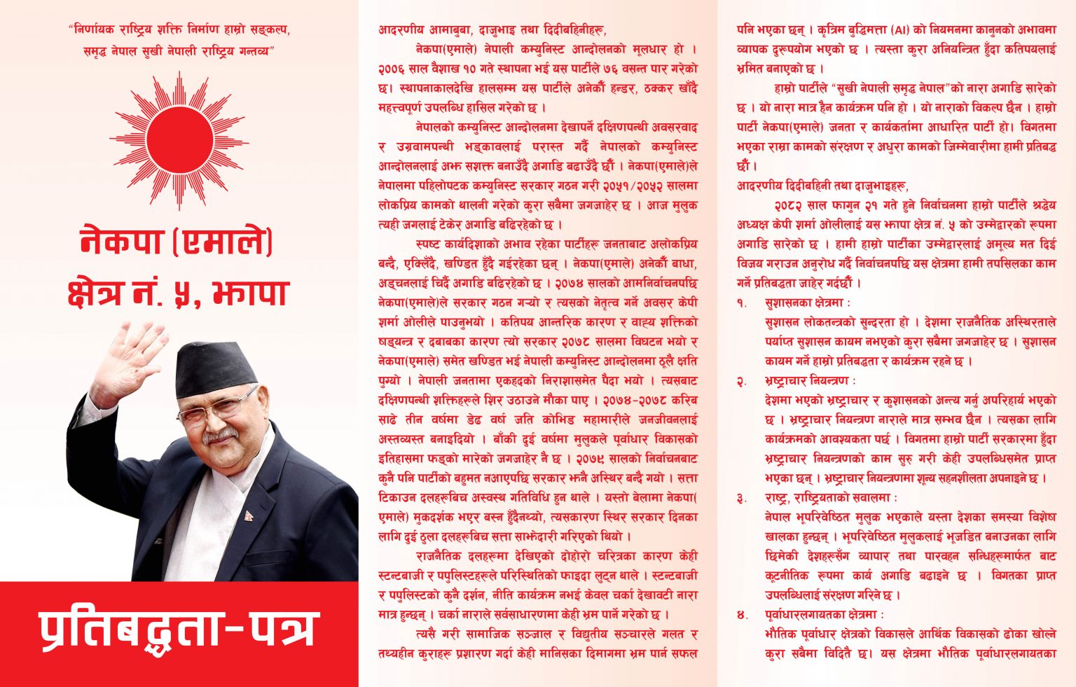 झापा । नेकपा (एमाले)का अध्यक्ष तथा झापा क्षेत्र नं. ५ का प्रतिनिधिसभा सदस्य उम्मेदवार केपी शर्मा ओलीले आफ्नो निर्वाचन क्षेत्रका लागि ४२ बुँदे प्रतिबद्धतापत्र सार्वजनिक गरेका छन्।