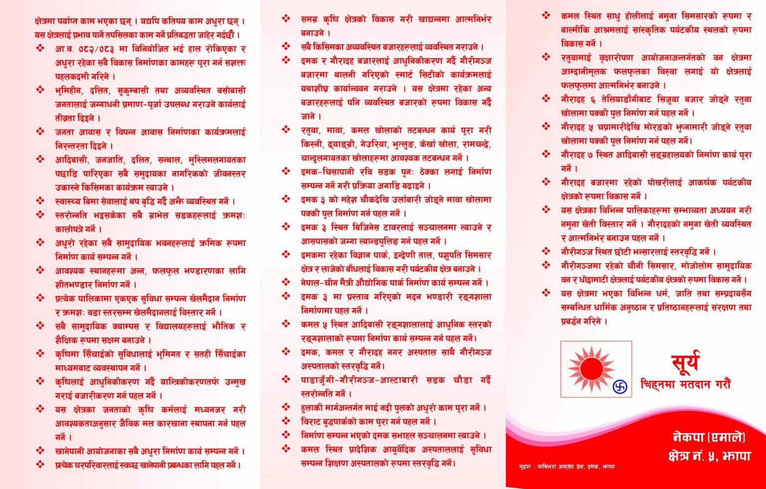 ‘निर्णायक राष्ट्रिय शक्ति निर्माण हाम्रो सङ्कल्प, समृद्ध नेपाल सुखी नेपाली राष्ट्रिय अभियान’ भन्ने मूल नारासहित सार्वजनिक प्रतिबद्धतापत्रमा कृषि, पूर्वाधार, शिक्षा, स्वास्थ्य, पर्यटन, सुशासन र रोजगारीलाई प्राथमिकतामा राखिएको छ।