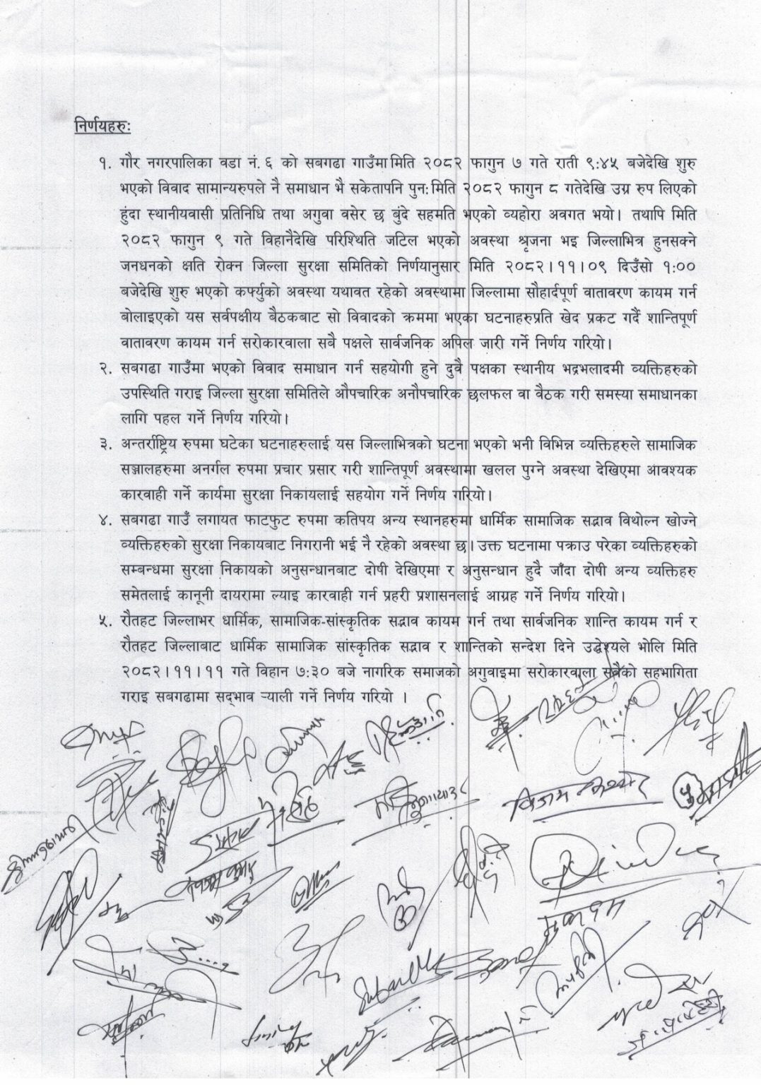 बैठकको निर्णयअनुसार सोमबार बिहान ७ः३० बजे नागरिक समाजका अगुवाहरूको सहभागितामा धार्मिक–सामाजिक–सांस्कृतिक सद्भाव र शान्तिको सन्देश दिने उद्देश्यले गौरमा सद्भाव र्‍याली निकालिनेछ। जिल्लामा सौहार्दपूर्ण वातावरण कायम राख्न सबै पक्षलाई संयमता अपनाउन सार्वजनिक अपिलसमेत जारी गरिएको छ।