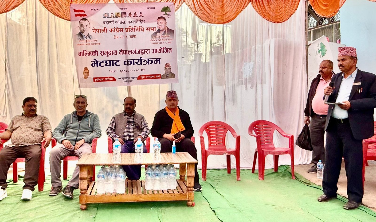 समुदायमा पुगेका कोइरालालाई बाल्मिकी समुदायका अगुवाहरुले बाँके क्षेत्र नम्बर २ मा नेपाली कांग्रेसलाई सहयोग गर्ने प्रतिवद्धता जनाएका थिए । भेटघाटका क्रममा नेपाली कांग्रेसका उम्मेदवार कोइरालासँग समुदायका अगुवाहरुले सहयोग गर्ने प्रतिवद्धता जनाएका हुन् ।