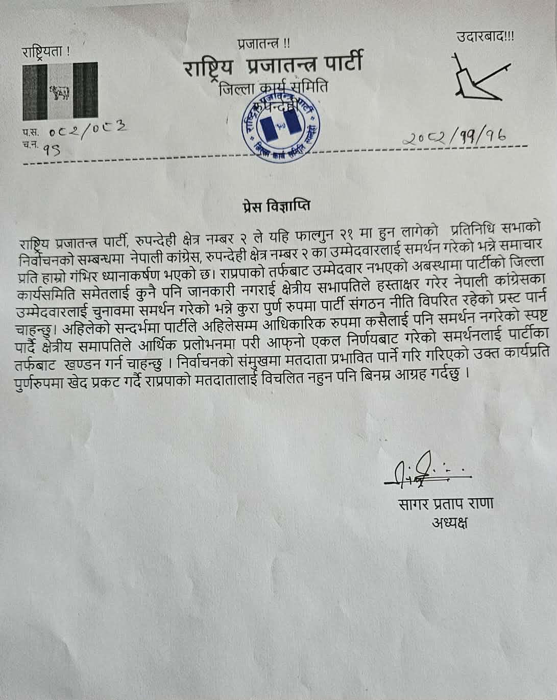 भैरहवा । राष्ट्रिय प्रजातन्त्र पार्टी (राप्रपा) रुपन्देहीका जिल्ला अध्यक्ष सागर प्रताप राणाले रुपन्देही क्षेत्र नम्बर-२ मा कुनै पनि राजनीतिक दलका उम्मेदवारलाई पार्टीले आधिकारिक रूपमा समर्थन नगरेको स्पष्ट पारेका छन् ।