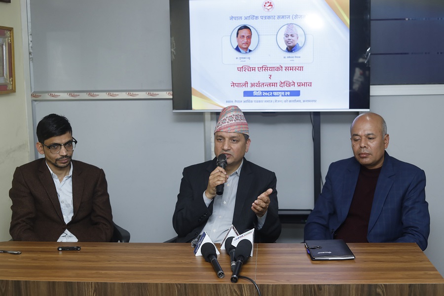 नेपाल आर्थिक पत्रकार समाज (सेजन)ले आज यहाँ आयोजना गरेको ‘पश्चिम एसियाको समस्या र नेपाली अर्थतन्त्रमा देखिने प्रभाव’ विषयक अन्तरक्रियामा अर्थ–आप्रावसन क्षेत्रका जानकारहरुले उक्त सङ्कटबाट जोगिन जतिसक्दो चाँडो पूर्वतयारीका काम अघि बढाउन सरकारको ध्यानाकर्षण गराए ।