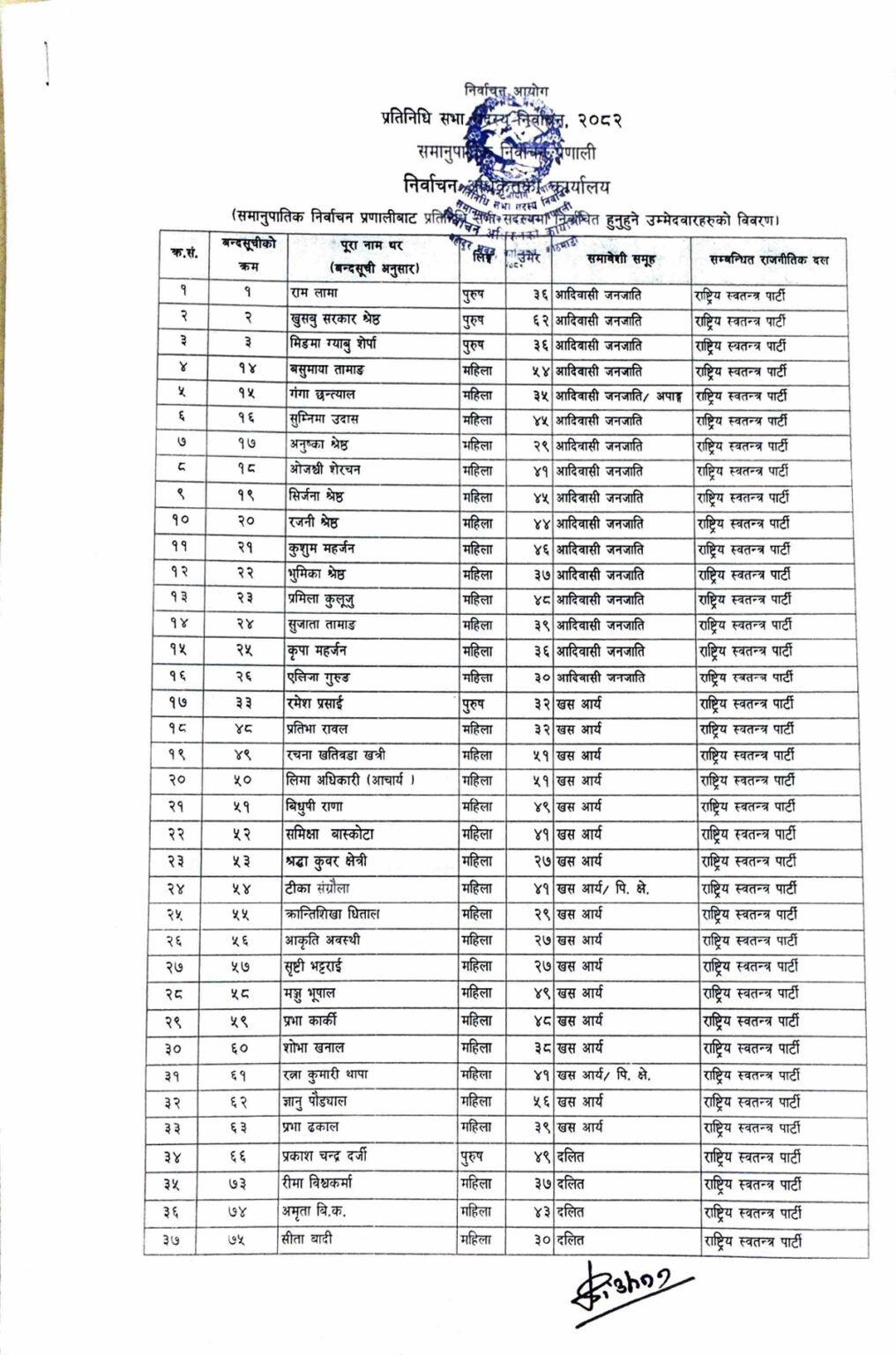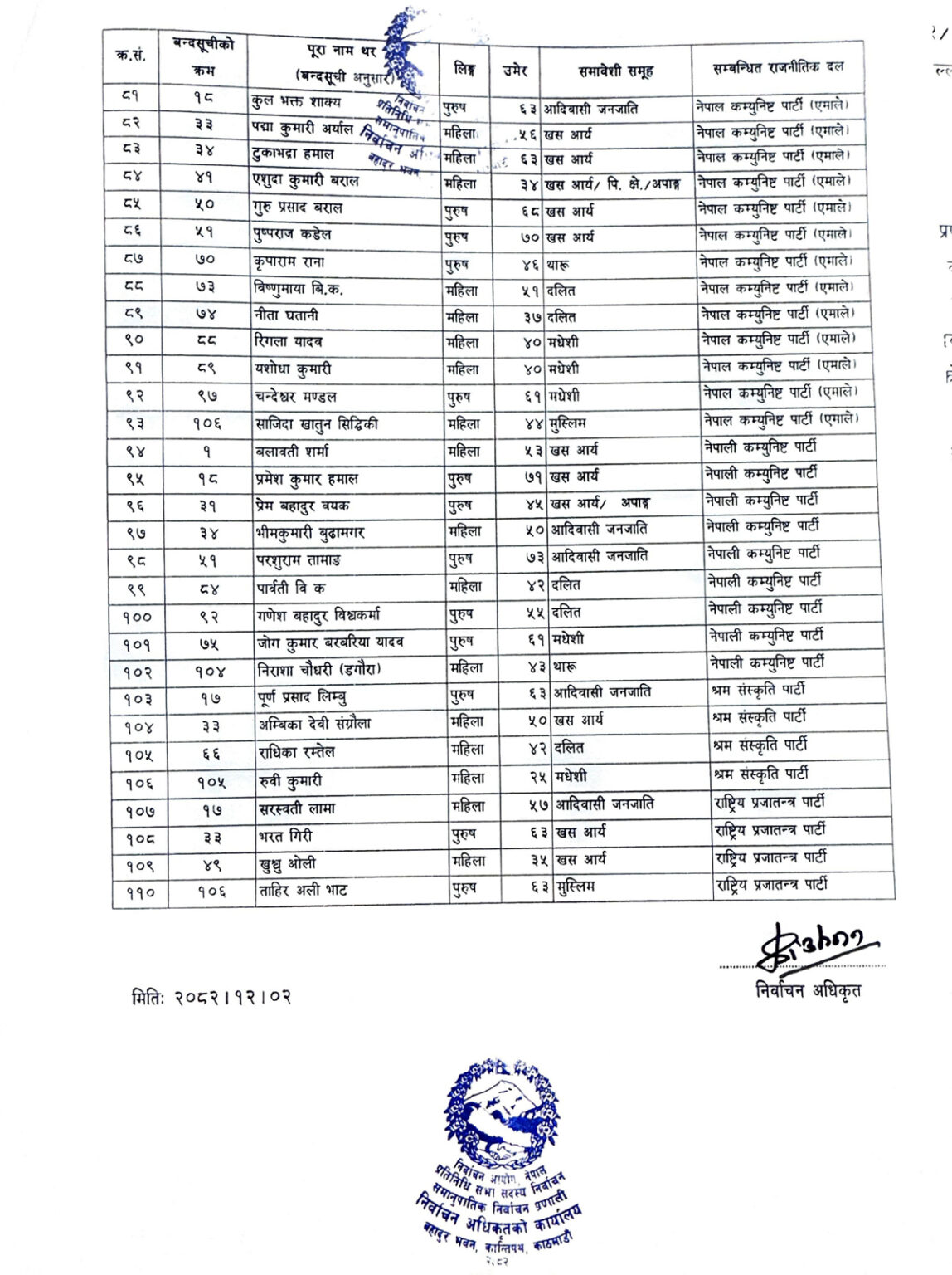 निर्वाचन आयोगद्वारा समानुपातिकतर्फ निर्वाचित ११० सांसदको सूची सार्वजनिक