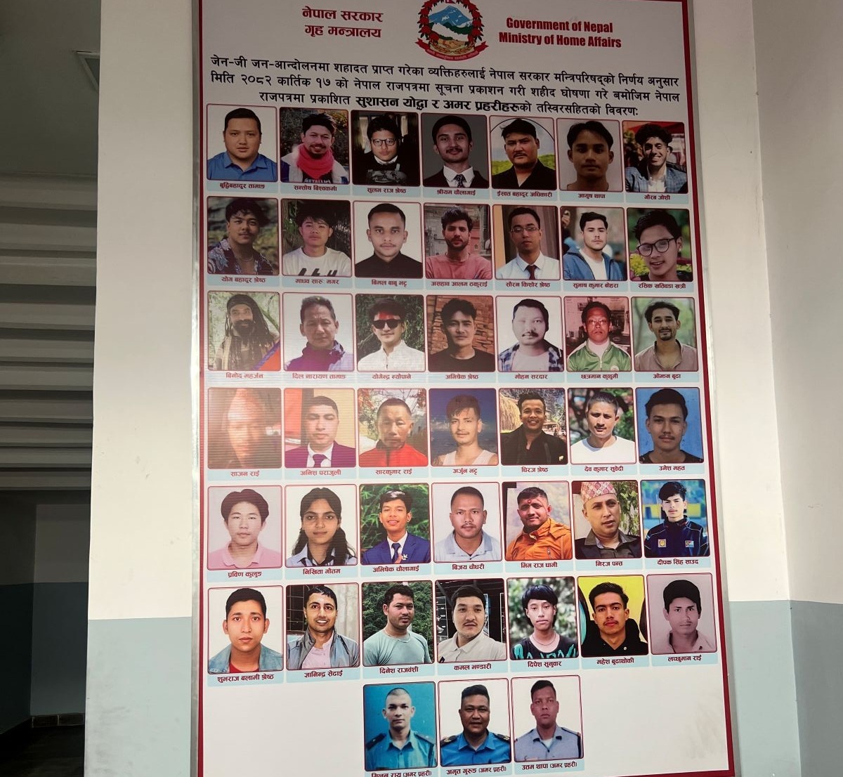 अनि जिज्ञाशा उब्जिन्छ- यी तस्बिर गृह मन्त्रालयको ढोकैमा किन ? एकछिन अडिएपछि यो प्रश्नको उत्तर भेटिन्छ । ती तस्बिर त तिनै योद्धाहरूका हुन्, जसले गत भदौ २३ र २४ गतेको जेनजी आन्दोलनका क्रममा सुशासन र परिवर्तनको आह्वान गर्दा जीवन अर्पण गरेका थिए ।