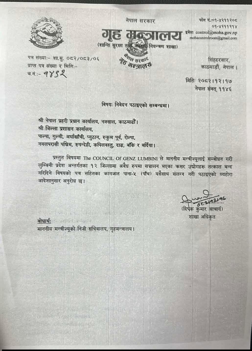 गृहमन्त्री गुरुङलाई बोधार्थ दिएर जिल्ला प्रशासन कार्यालयहरुमा पठाइएको पत्रमा भनिएको छ, ‘लुम्बिनी प्रदेश अन्तर्गतका १२ जिल्लामा अवैध रुपमा सञ्चालन भएका क्रसर उद्योगहरू तत्काल बन्द गरिदिने विषयको पत्रसहितका कागजात पाना ५ यसैसाथ संलगन गरी पठाइएको बेहोरा आदेशानुसार अनुरोध छ।’