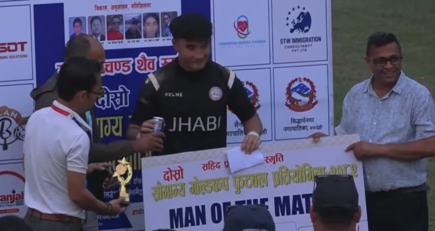 यता फोर ब्रर्दशका रंजित चौधरी र सलिल ढकालको प्रहार बाहिरिएको थियो भने आशिष थापाको प्रहार सम्पुर्णका गोलकिपर बिशाल सुनारले रोकिदिए । उनि खेलमा प्लयेर अफ दी म्याचबाट पुरस्कृत भए । प्रतियोगिताको प्लेयर अफ दी म्याच सम्पुर्ण एफसीका गोलकिपर बिशाल सुनारलाई नेपाल पत्रकार महासंघ रुपन्देही शाखाका अध्यक्ष दिनेश पाण्डेले पुरस्कार वितरण गरेका छन । शनिबार फर्साटिकर एफसी र मोनष्टर गाईज सुनवलका बिचमा खेल हुने क्लबका अध्यक्ष सुजु मल्लले बताए ।