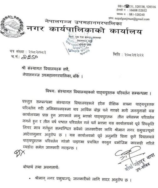 नेपालगन्ज । नेपालगन्ज उपमहानगर क्षेत्रमा सञ्चालनमा रहेका संस्थागत (नीजि) विद्यालयहरुलाई ३ वर्ष सम्म पाठ्यपुस्तक परिवर्तन गर्न निषेध गरेको छ । नेपालगन्ज उपमहानगरपालिकाले आज एक सूचना जारी गर्दै संस्थागत विद्यालयमा लागु भएको तीन वर्ष सम्म पाठ्यपुस्तक परिवर्तन नगर्न निर्देशन गरेको हो ।