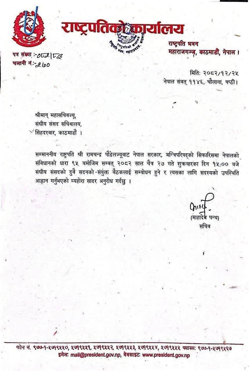 राष्ट्रपति पौडेलले सरकारको सिफारिसमा संयुक्त बैठकलाई सम्बोधन गर्न लागेका राष्ट्रपति कार्यालयले संसद सचिवालयमा पठाएको पत्रमा उल्लेख छ ।