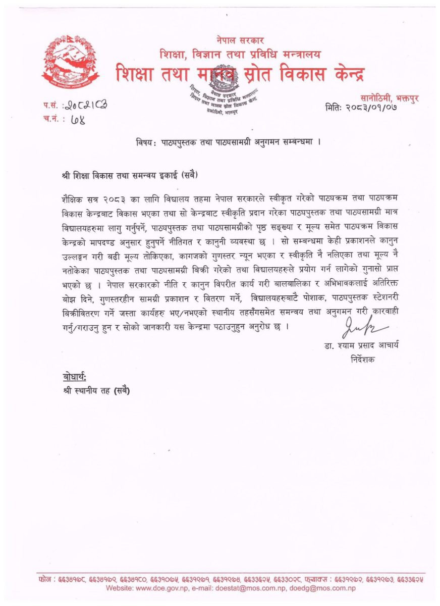 शिक्षा विकास तथा समन्वय एकाईलाई संबोधन गरिएको पत्रमा भनिएको छ, ‘नेपाल सरकारको नीति र कानुनविपरीत कार्य गरी बालबालिका र अभिभावकलाई अतिरिक्त बोझ दिने, गुणस्तरहीन सामग्री प्रकाशन र वितरण गर्ने, विद्यालयबाटै पोशाक, पाठ्यपुस्तक, स्टेसनरी विक्रीवितरण गर्ने जस्ता कार्यहरू भएरनभएको स्थानीय तहसँग समेत समन्वय तथा अनुगमन गरी कारबाही गर्नुरगराउनु हुन र सोको जानकारी यस केन्द्रमा पठाउनुहुन अनुरोध छ।’