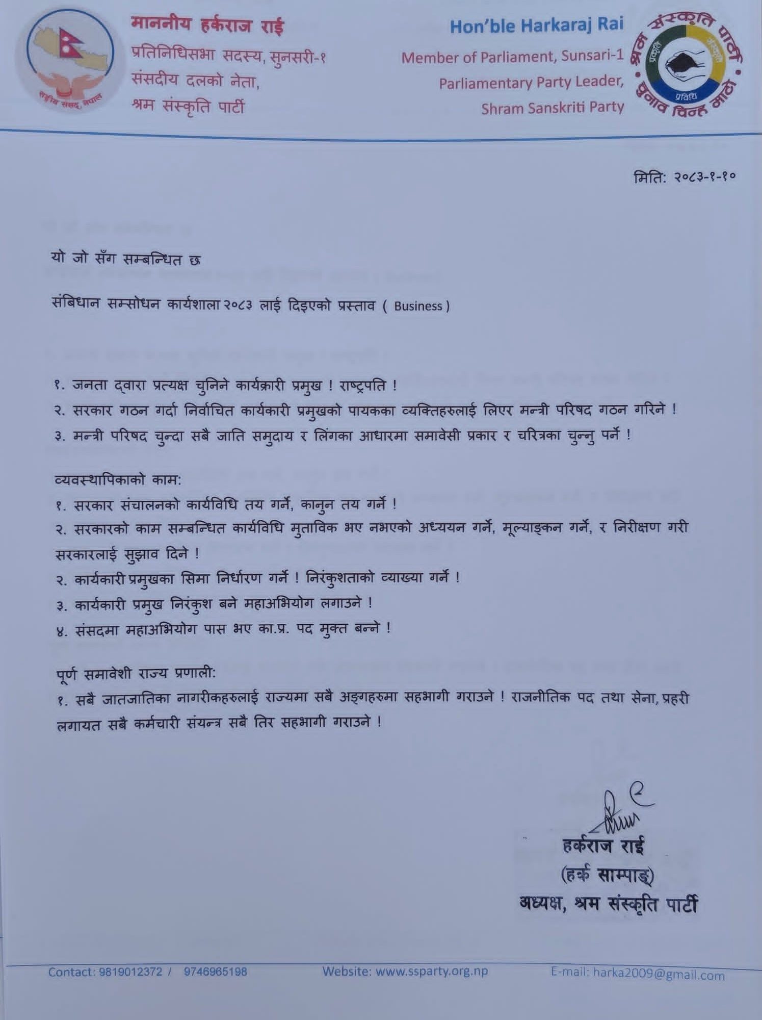 काठमाडौं । श्रम संस्कृति पार्टीले बालेन्द्र सरकारले प्रस्ताव गरेको संविधान संशोधनको एजेण्डामा सुझाव पठाएको छ । सो पार्टीले ‘संविधान संशोधन बहसपत्र तयार गर्ने कार्यदल–२०८२ लाई श्रम संस्कृति पार्टीको तर्फबाट आज ९ बुँदे लिखित सुझाव दिएको हो ।