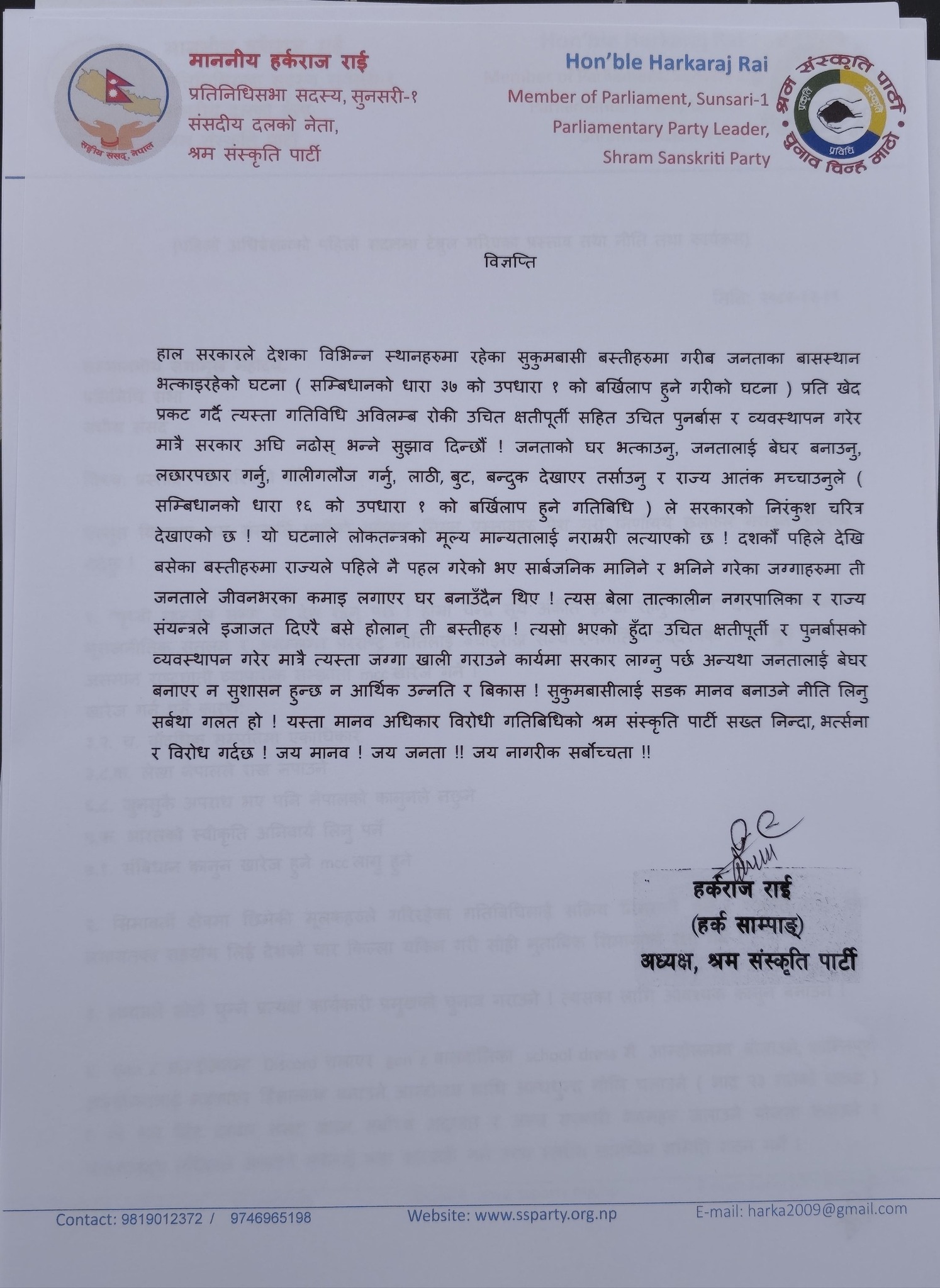“जनतालाई बेघर बनाएर न सुशासन हुन्छ, न आर्थिक उन्नति र विकास,” विज्ञप्तिमा भनिएको छ।