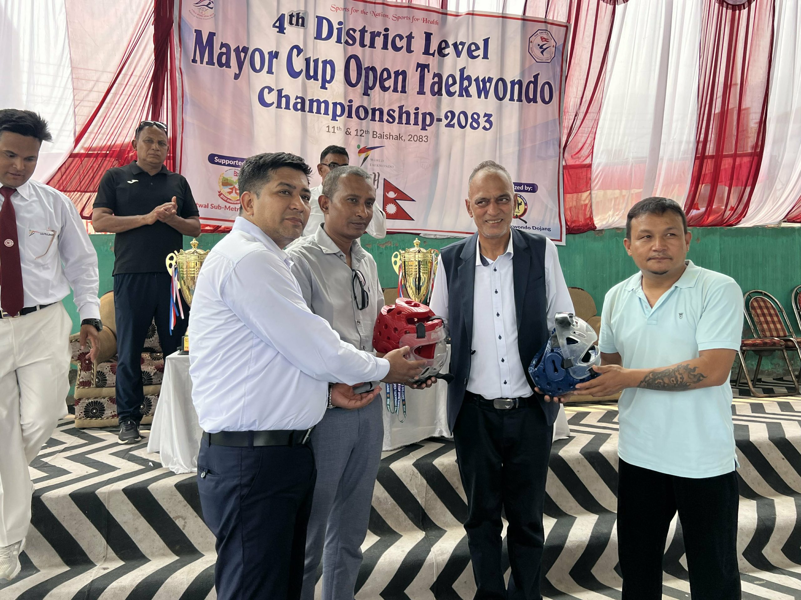 बुटवल । चौँथो जिल्लास्तरीय मेयर कप खुला तेक्वाण्डो प्रतियोगिता २०८३ शुरु भएको छ । बुटवल उपमहानगरपालिकाको सहयोग तथा बुटवल तेक्वाण्डो डोजाङको आयोजनामा भएको प्रतियोगिताको बुटवल उपमहानगरपालिका नगरप्रमुख खेलराज पाण्डेयले प्रमुख रेफ्रीलाई खेल सामग्री हस्तान्तरण गर्दै उद्घाटन गरे । उनले खेल पर्यटनको सम्भावनालाई उजगार गर्ने गरि नगरमा खेल गतिविधि र कार्यक्रमहरु योजनावद्ध रुपमा अघि बढेको बताए ।