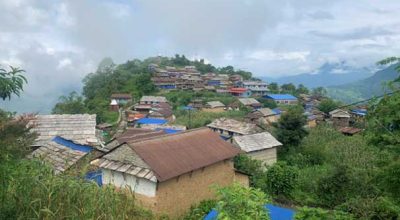 अन्नपूर्ण । माथि हिमाल । तल पोखरा उपत्यका । थुम्कोमा अर्मलाकोट गाउँ । धेरै ढुङ्गाले