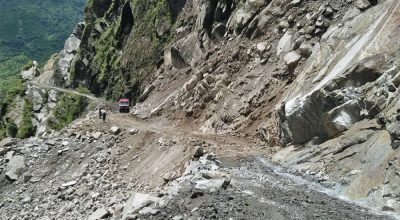 पर्वत । पर्वतको मोदी गाउँपालिका-६ स्थित महभिरमा सडक माथिबाट ढुङ्गा खस्दा मध्यपहाडी राजमार्गको पोखरा-पर्वत खण्ड