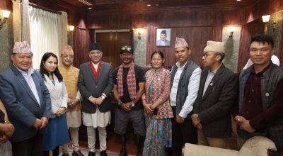 काठमाडौं । प्रधानमन्त्री पुष्पकमल दाहाल ‘प्रचण्ड’ले दुवै खुट्टा गुमाएका कीर्तिमानी सगरमाथा आरोही हरिबहादुर बुढालाई सिंहदरवारमा भेटेर
