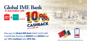 काठमाडौं । ग्लोबल आइएमई बैंक लिमिटेडले आफ्ना ग्राहकहरुलाई मिनिसो र मिसियोका स्टोरहरूबाट सामान किन्दा १०