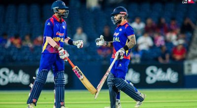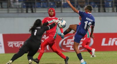 काठमाडौं । काठमाडौंमा जारी साफ महिला च्याम्पियनसिप अन्तर्गत समूह चरणको अन्तिम खेलमा नेपालले श्रीलंकाविरुद्ध पहिलो हाफमा ४-० गोलको अग्रता लिएको छ । अहिले काठमाडौंस्थित दशरथ रंगशालामा जारी खेलको पहिलो हाफमा नेपालले ४-० को अग्रता लिएको हो । खेलको आठौं मिनेटमा सविताको गोलमा नेपालले अग्रता लियो । साम्बाले दायाँ विंगबाट पेनाल्टी क्षेत्र भित्र बल लग्दै दिएको…