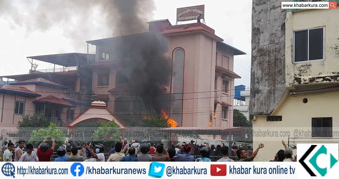 बुटवल । बुटवलको सुख्खानगरस्थित नेकपा (एमाले) लुम्बिनी प्रदेश पार्टी कार्यालयमा प्रदर्शनकारीहरूले आगजनी र तोडफोड गरेका छन् । मंगलबार उग्र बनेका प्रदर्शनकारीहरूको समूहले पार्टी कार्यालयमा प्रवेश गरी सामान तोडफोड गर्नुका साथै आगो लगाएको स्थानीयहरूले बताएका छन् । घटनापछि कार्यालय परिसरमा धुवाँको मुस्लो देखिएको र वरपरको क्षेत्र अशान्त बनेको प्रत्यक्षदर्शीहरू बताउँछन् । सुरक्षा निकायले अवस्था नियन्त्रणमा लिन…