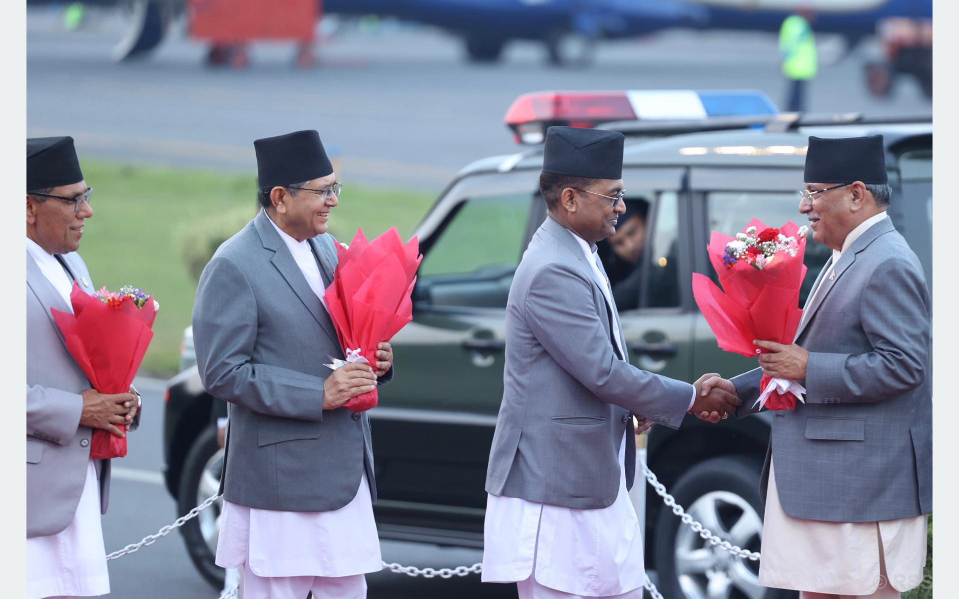Kathmandu: Prime Minister Pushpa Kamal Dahal 'Prachanda' has returned home this evening after completing his official visit to India. Upon arrival at the VVIP lounge of Tribhuvan International Airport, the Prime Minister was welcomed by Speaker Devraj Ghimire, National Assembly Chair Narayan Dahal, Deputy Prime Ministers, Ministers, MPs, Heads of Security Agencies and high-ranking officials…