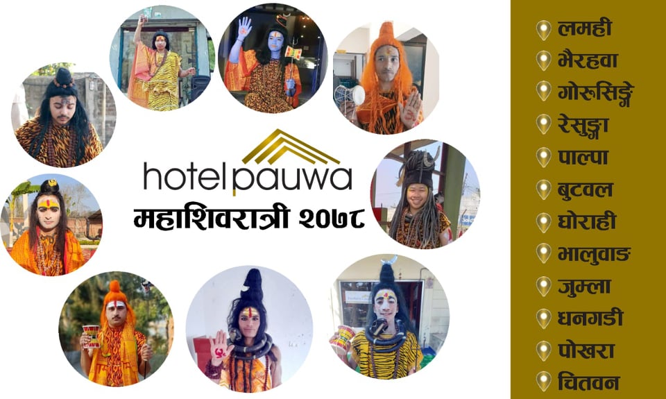 बुटवल । हिन्दु धर्मावलम्बीहरुको विशेष पर्व शिवरात्रीको अवसरमा होटल पौवा प्रालिले विशेष शुभकामना कार्यक्रम गरि मनाएको छ । पौवा ग्रुपले शिवरात्रिका अवसरमा पौवाका ११ वटा शाखामा भजनकिर्तन गरि मनाएका जनाएको छ । बुधबार सबै शाखामा महाशिवरात्री विशेष भजन कार्यक्रम तथा प्रसाद ग्रहण कार्यक्रम गरि मनाएको हो । हिन्दु क्यालेन्डर अनुसार फागुन कृष्ण चतुर्दशीको दिन शिवरात्री…