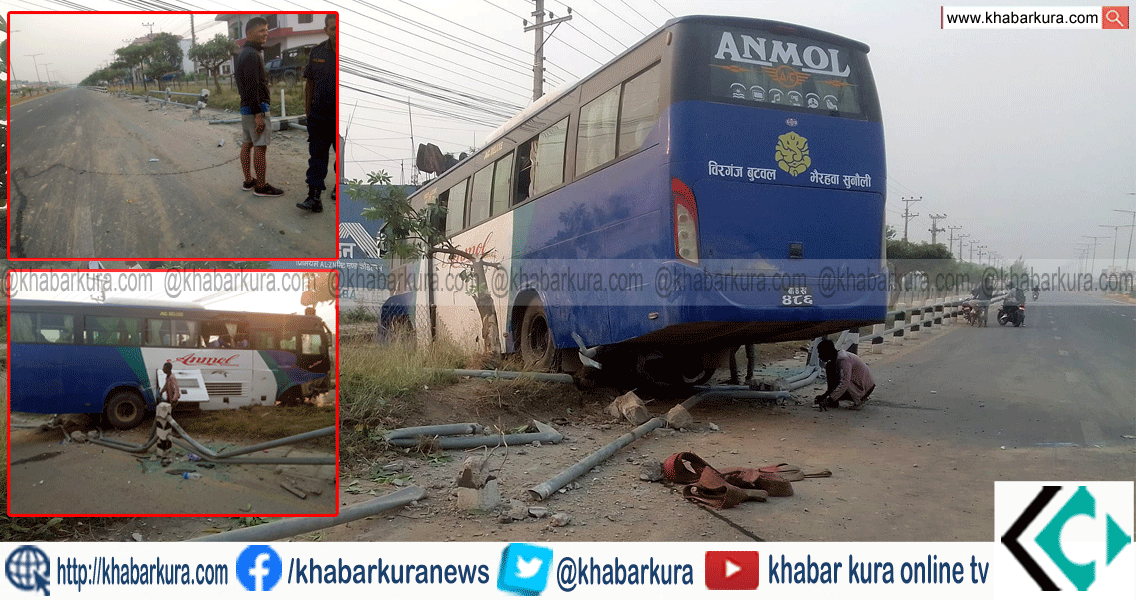 बुटवल । रुपन्देहीको तिलोत्तमामा आज बिहान भयानक बस दुर्घटना भएको छ । विरगञ्जदेखि भैरहवाका लागि छुटेको उक्त बस आफै अनियन्त्रीत भई तिलोत्तमा १५ कोटिहवामा सडक छेउको रेलिङमा ठोक्किएको हो । दुर्घटना कुनै मानवीय क्षति भने भएको छैन । जिल्ला प्रहरी कार्यालय रुपन्देहीकी प्रवक्ता प्रहरी नायव उपरीक्षक (डिएसपी) लक्ष्मी खनालका अनुसार बा ४ ख ४८६ नम्बरको…