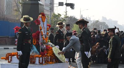 काठमाडौं । राष्ट्रपति रामचन्द्र पौडेलले राष्ट्रनिर्माता पृथ्वीनारायण शाहको सालिकमा पुष्पहार अर्पण गरी सम्मान व्यक्त गरेका छन । उनले आज बिहान सिंहदरबार पश्चिम मूलद्वारस्थित राष्ट्रनिर्माताको सालिकमा पुष्पहार अर्पण गरी सम्मान व्यक्त गरेका हुन । सो अवसरमा नेपाली सेनाको एक टुकुडीले सम्मान गारत अर्पण गरेको थियो भने समाजका विभिन्न क्षेत्रका लब्धप्रतिष्ठित व्यक्तिहरुले समेत राष्ट्रनिर्माता शाहको सालिकमा माल्यार्पण…