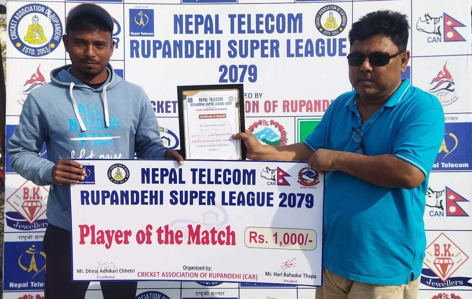 भैरहवा । भैरहवामा जारी नेपाल टेलिकम रुपन्देही सुपरलिग क्रिकेट प्रक्रियोगितामा शुक्रबार भएको डिभिजन ‘बी’को खेलमा प्रोफेसनल मास्टर्स ११ विजयी भएको छ । उसले लुम्बिनी शाक्यानलाई ३ सय २८ रनको विशाल रन अन्तरले पराजित गर्दै जित निकालेको हो । लिगको इतिहासमा यति ठूलो रन अन्तरले हारजित भएको यो पहिलो पटक हो । सिद्धार्थ रंगशालामा टस जितेर…