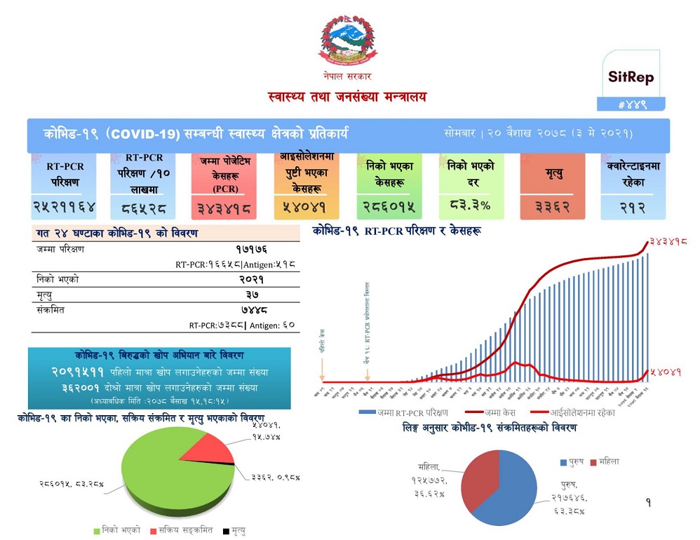 काठमाडौं । सोमबार कोरोना भाइरसबाट थप ७ हजार ४४८ जनामा संक्रमण पुष्टि भएको छ । स्वास्थ्य तथा जनसंख्या मन्त्रालयले अद्यावधिक गरेको पछिल्लो कोरोना तथ्यांकअनुसार १७ हजार १७६ परीक्षण गर्दा ७ हजार ४४८ जनामा संक्रमण पुष्टि भएको हो । १६ हजार ६५८ पीसीआर परीक्षण गर्दा ७ हजार ३८८ जनामा र ५१८ एन्टीजेन परीक्षण गर्दा ६० जनामा…