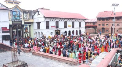 काठमाडौं । भगवान् शिवको पूजा आराधना गर्न साउनको अन्तिम सोमबार पशुपतिनाथ मन्दिरमा भक्तजनको घुईचो । तस्बिर : विमलबहादुर विष्ट/रासस