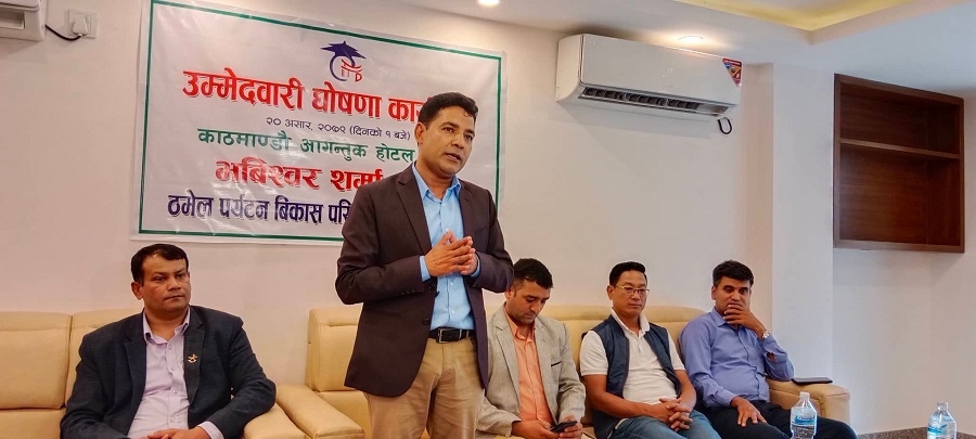 काठमाडौं । ठमेल पर्यटन विकास परिषद्को अध्यक्षमा भविश्वर शर्माले उम्मेद्वारी घोषणा गरेका छन् । परिषद्का वर्तमान उपाध्यक्षसमेत रहनुभएका शर्माले आज पत्रकार सम्मेलन गरी आगामी दुई वर्षे कार्यकालका लागि अध्यक्ष पदका लागि उम्मेदवारी घोषणा गरेका हुन् । पत्रकार सम्मेलनमा अध्यक्ष पदका उम्मेदवार शर्माले ठमेललाई आन्तरिक र बाह्य पर्यटकको विशेष पर्यटकीय क्षेत्र बनाउनका लागि आफुले अध्यक्ष पदमा…