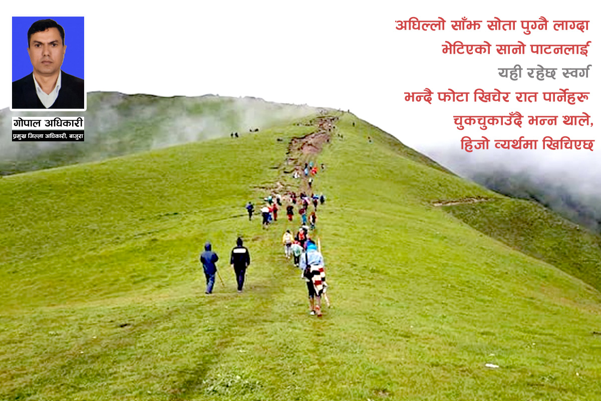 बाजुरा जिल्ला प्रशासन कार्यालयमा हाजिर भएदेखि नै बिहान र साँझ उकालो-ओरालो मज्जैले हिँड्न थालेको थिएँ । एकप्रकारले यो मेरो बडीमालिका जाने पूर्वतयारी थियो । दुई महिना नहुँदै ढाड दुखेर हैरान, हिँड्नै कठिन हुन थाल्यो । जिल्लामा उपलब्ध डाक्टरकहाँ जचाउँदा आराम गर्नुपर्ने सल्लाह दिए । हिँड्डुल पनि बन्द भयो । बडीमालिका जाने रहर यत्तिकै तुहिएला जस्तो…