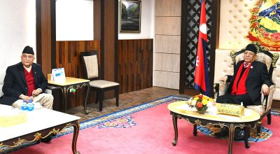 काठमाडौं । प्रधानमन्त्री पुष्पकमल दाहाल प्रचण्डसँग नेकपा एमालेका अध्यक्ष केपी शर्मा ओलीले आज पुनः भेटवार्ता